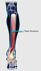 Al tibial posterior lo encontramos en el compartimiento posterior profundo de la pierna emerge en el tercio medio de la pierna en su unión miotendinosa dando lugar al tendón que ira por detrás del maleolo medial, un poco mas anterior que el flexor común de los dedos, en el retinaculo de los flexores y de hay sale al pie dividiéndose en varias prolongaciones para insertarse en la tuberosidad del navicular, en la parte inferior de la capsula de la calcáneo navicular y de la cuña media.